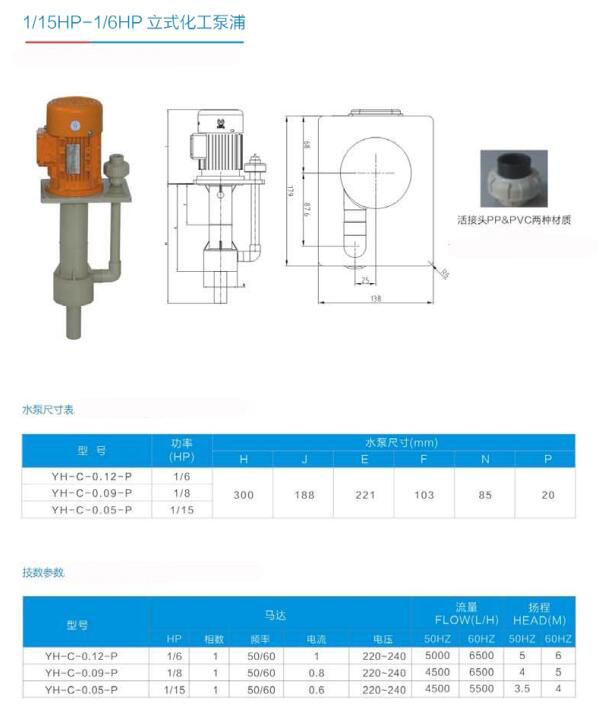 4. 泵浦的入口管可加长,出液口活接可以选配不同材质(PP,PVC)的转接件。